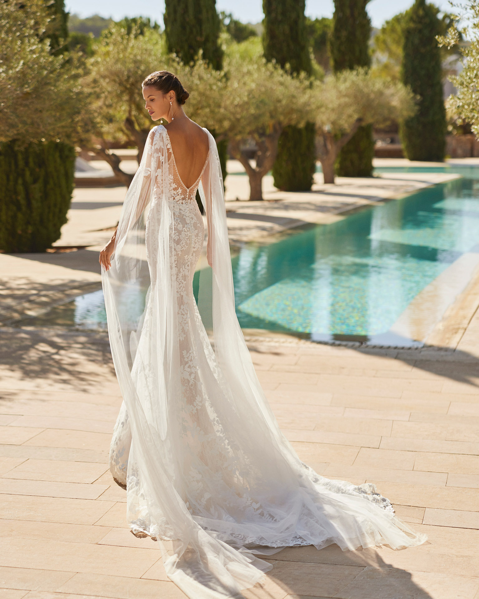 The Selma gown captures pure femininity and grace. Crafted in beaded lace, this mermaid silhouette flatters the figure with exquisite elegance. The V-neckline and pearl-embellished straps add luminosity and refinement, while the open back exudes subtle sensuality. Finished with a soft tulle cape, this gown blends modern sophistication with a romantic, ethereal charm.