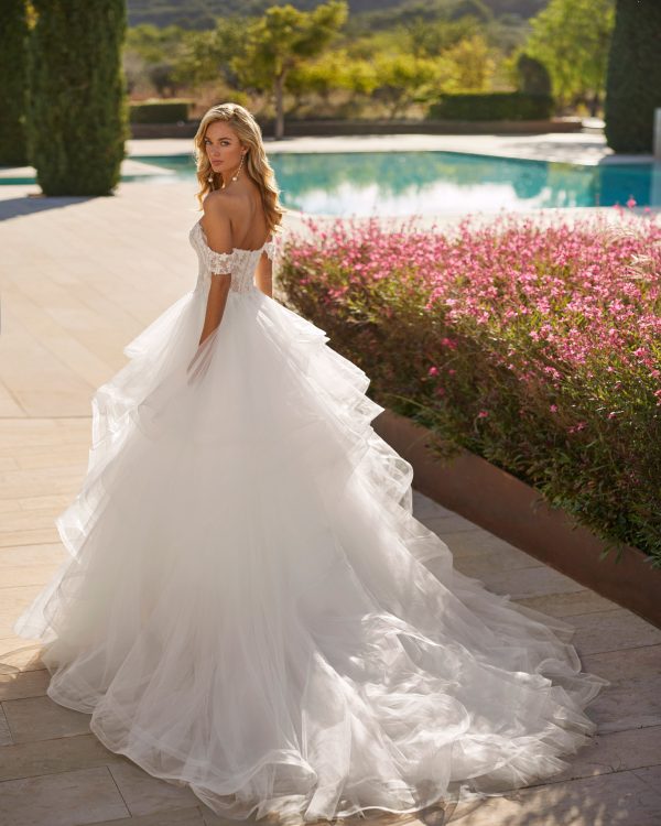 Majestic princess-style wedding gown in airy tulle, featuring an intricately beaded lace bodice. The deep V-neckline enhances the neckline gracefully, while the delicate straps and V-shaped back add a modern, ethereal touch. A radiant design for the bride seeking timeless elegance and refined romance.