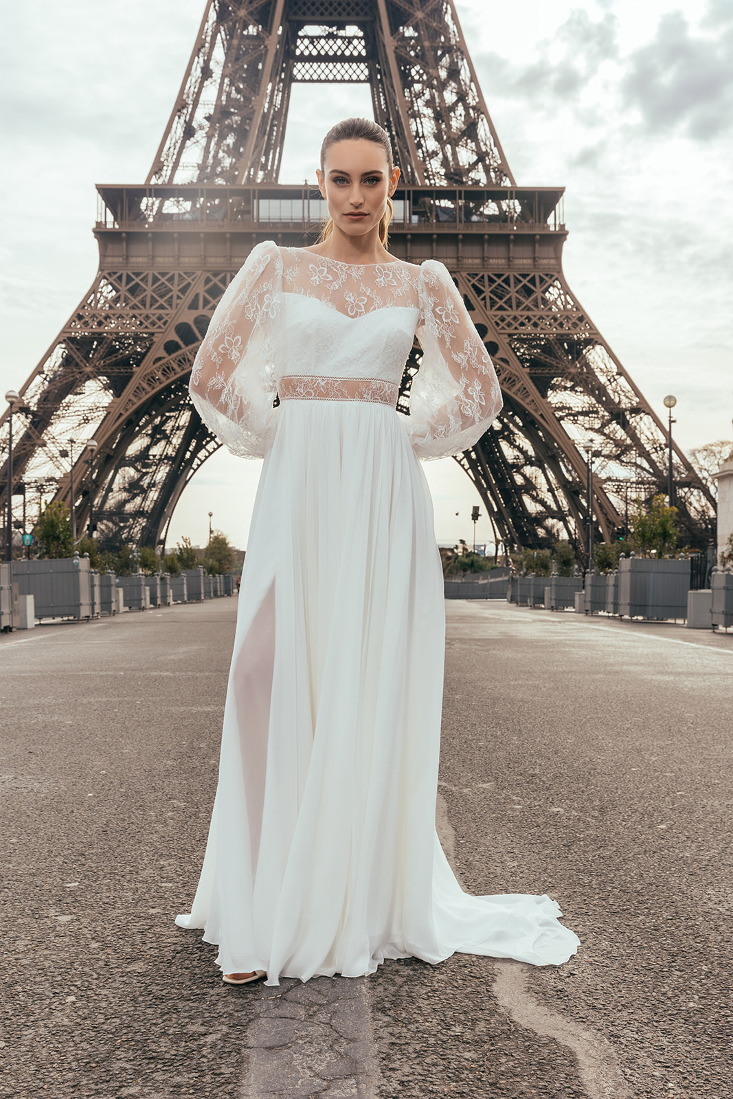 The Amine wedding gown captures the essence of bohemian chic, blending modernity with romantic flair. Crafted from airy chiffon and delicate Calais-Caudry lace, it stands out for its lightness and refinement. The illusion bodice with a bateau neckline is adorned with floral lace patterns, paired with soft gigot sleeves for a couture-inspired look. A sheer lace waistband gently defines the waist, while the open rounded back adds a sensual touch. The flowing A-line skirt offers graceful movement, enhanced by a daring front slit for subtle femininity. A poetic and unique design, combining elegance and comfort, perfect for the bride who dreams of effortless bohemian style.