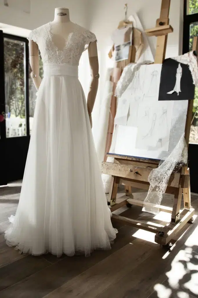 Bobbin lace and tulle dress. V-neck bodice, decorated with embroidered lace appliqués. Attached lace sleeves. Waist highlighted with a draped bobbin tulle belt. Skirt made up of clouds of soft tulle circles.