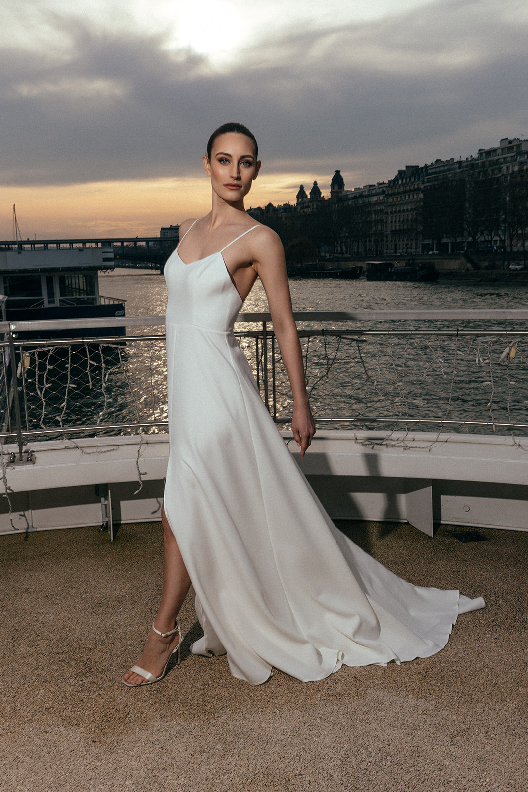 A sleek crepe sheath wedding gown with a minimalist, glamorous spirit. Its pure, clean lines are elevated by subtle, sensual details. The softly angled square neckline with thin straps highlights the shoulders and neckline with finesse. The deep open back adds a confident, alluring touch, while the front slit elongates the silhouette and reveals the leg with bold elegance. The fitted skirt sculpts the figure and extends into a flowing train, bringing movement and grace. A sophisticated, modern gown designed for today’s bride — confident, stylish, and true to her own personality.