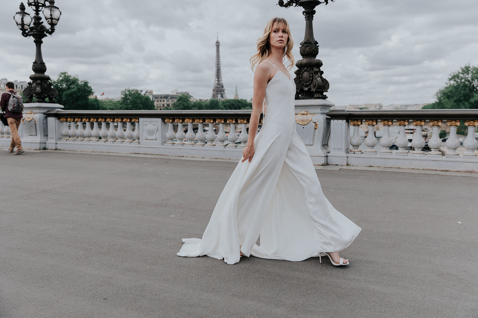 The Rive wedding jumpsuit, Cymbeline Podium collection is a fluid crepe wedding jumpsuit. Its V-neckline at the front and its plunging back bring glamor and elegance to this wedding outfit. Its wide cut-out pants that give a fluid skirt effect offer a very elegant and romantic effect to the whole. This combination is the ideal ally for a civil wedding or a summer wedding.