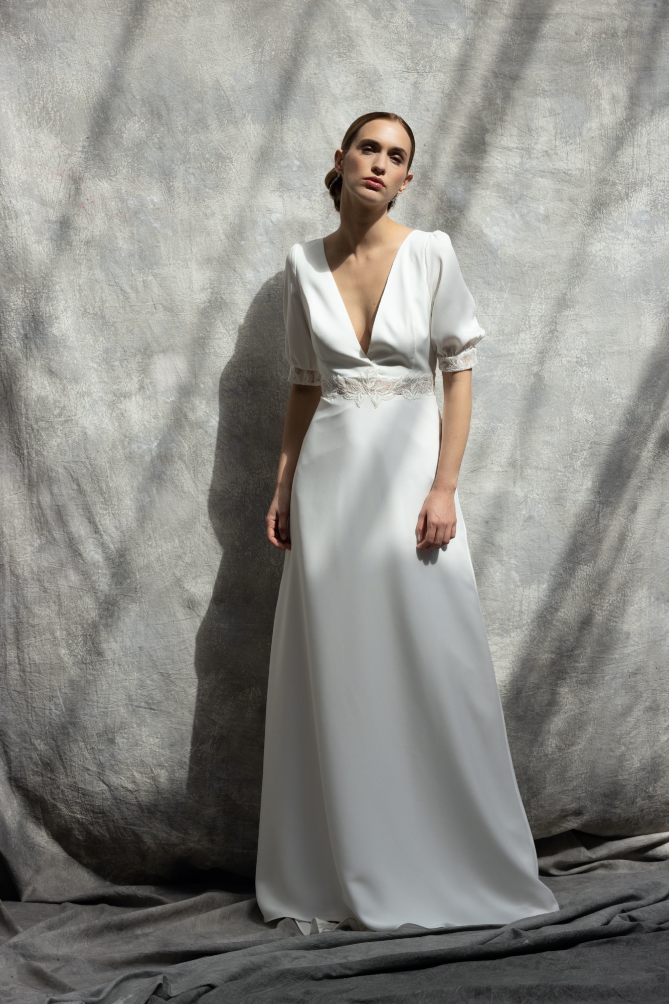 The Solo wedding dress, Paris collection by Cymbeline, from the Anne de Lafforest collaboration for Cymbeline, is an A-line wedding dress in crepe, which will delight brides looking for a romantic and refined ceremony dress . Its wrap-effect plunging neckline and deep V-back neckline give it a very glamorous touch. The waist and the end of the slightly puffed three-quarter sleeves are enhanced by a play of transparency adorned with leaf-pattern braids, bringing delicacy and modernism to this flowing wedding dress. Its A-line skirt defines the character of this model, ideal for a chic and elegant bohemian wedding.
