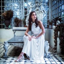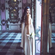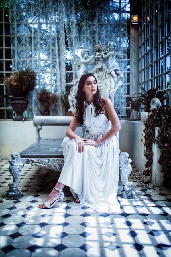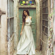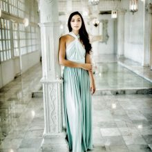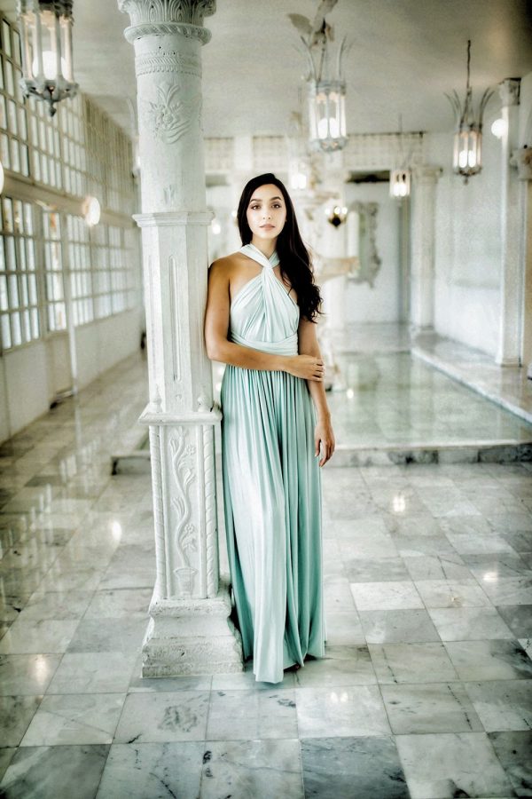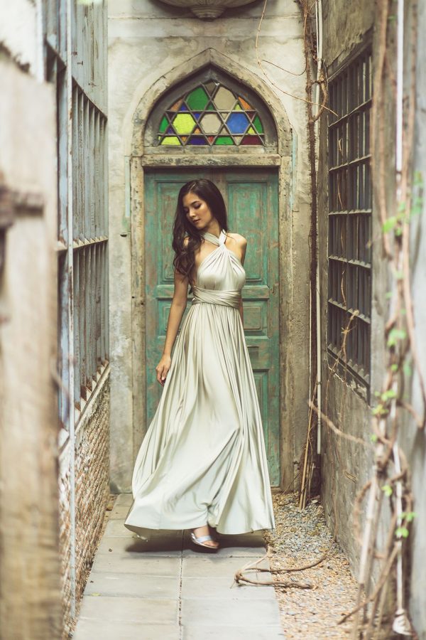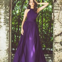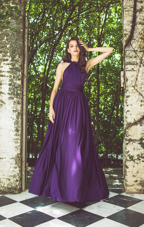Fluid cocktail dress in stretch fabric, can be worn in multiple ways to make each bridesmaid unique. The multi-position cocktail dress perfectly adapts to all body types. The waist is nicely defined by a belt.