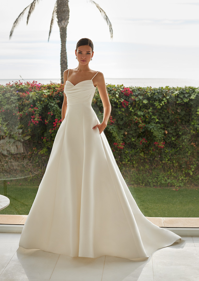 Our Lyla design is a gown of sheer elegance for the fashion forward and singular bride. The exquisitely tailored fresh and simple A-line is stylishly adorned with a perfectly structure bodice with asymmetrical gathering, delicate thin straps and a gorgeous corset-tie embellishment. The effect is pure glamour.