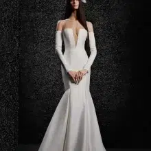 A smooth mermaid gown with dramatic features. A pointed plunge bodice anchors a fishtail skirt cut with box pleats for added volume. Glove sleeves and optional nude tulle yoke and back.
