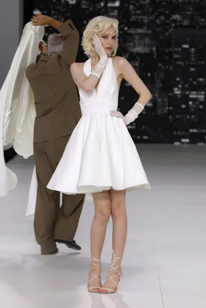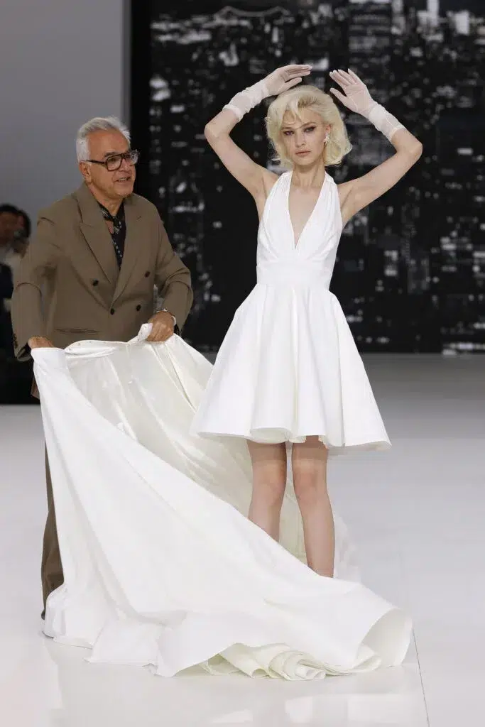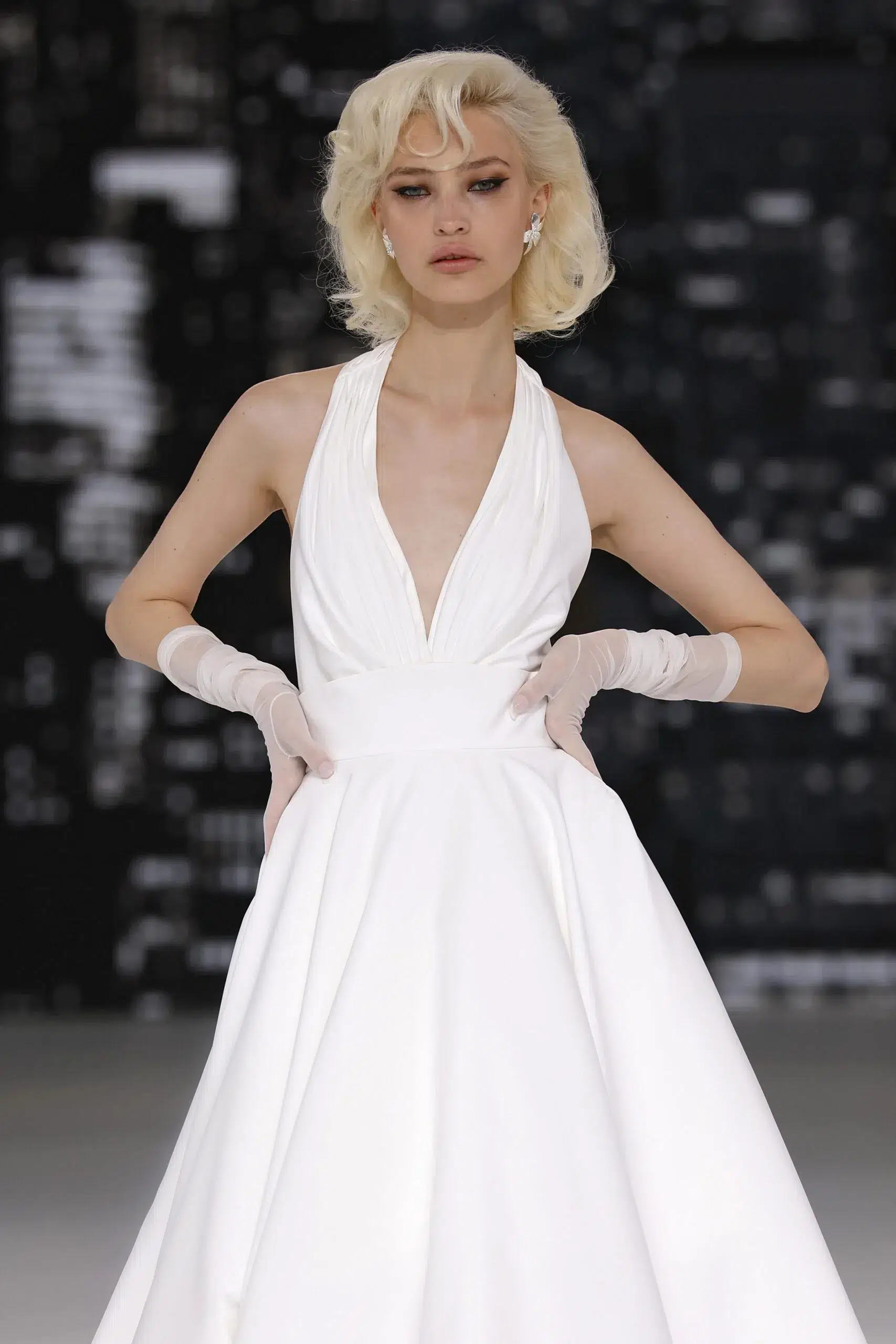 Une silhouette A-line épurée réalisée en Sergine, avec un décolleté collier drapé qui se noue derrière la nuque. Sa taille marquée vient structurer la ligne et mettre en valeur l’allure avec élégance. La jupe ample façon patineuse s’évase avec fluidité, tandis que les boutons délicats au dos ajoutent une touche féminine et raffinée. Une création intemporelle, glamour et moderne à la fois.