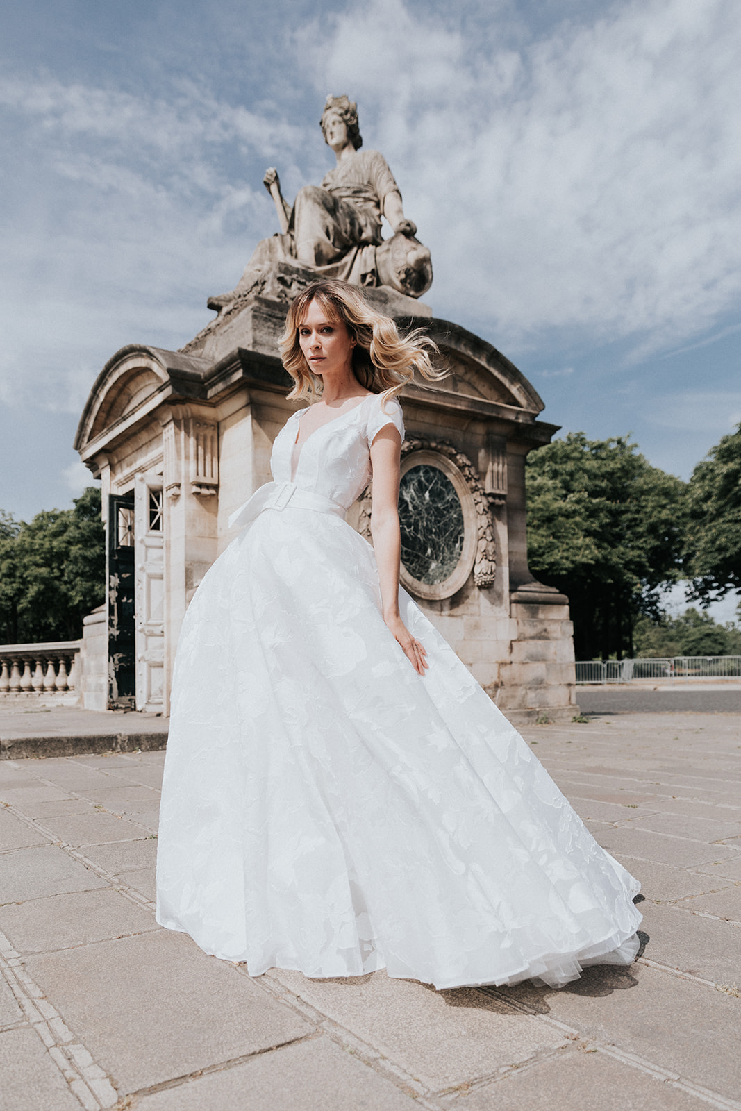 La robe de mariée Raffinée, de Cymbeline, est une magnifique robe de mariée New-Look faite d’organza et de soie dévorée. Sa taille soulignée d’une ceinture à boucle vient marquer la silhouette et la mettre en valeur, et ses manches courtes en font l’allié idéal pour un mariage estival. Sa jupe longue et volumineuse donne un effet princesse à l’ensemble et saura conquérir le cœur des mariées les plus romantiques.