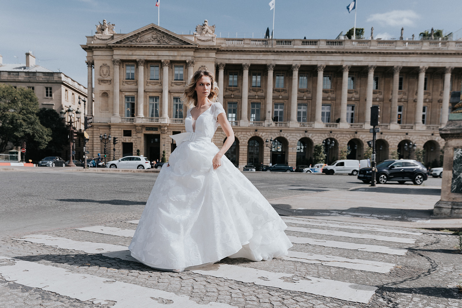 Robe de mariée princesse, organza, soie dévorée, manches courtes.