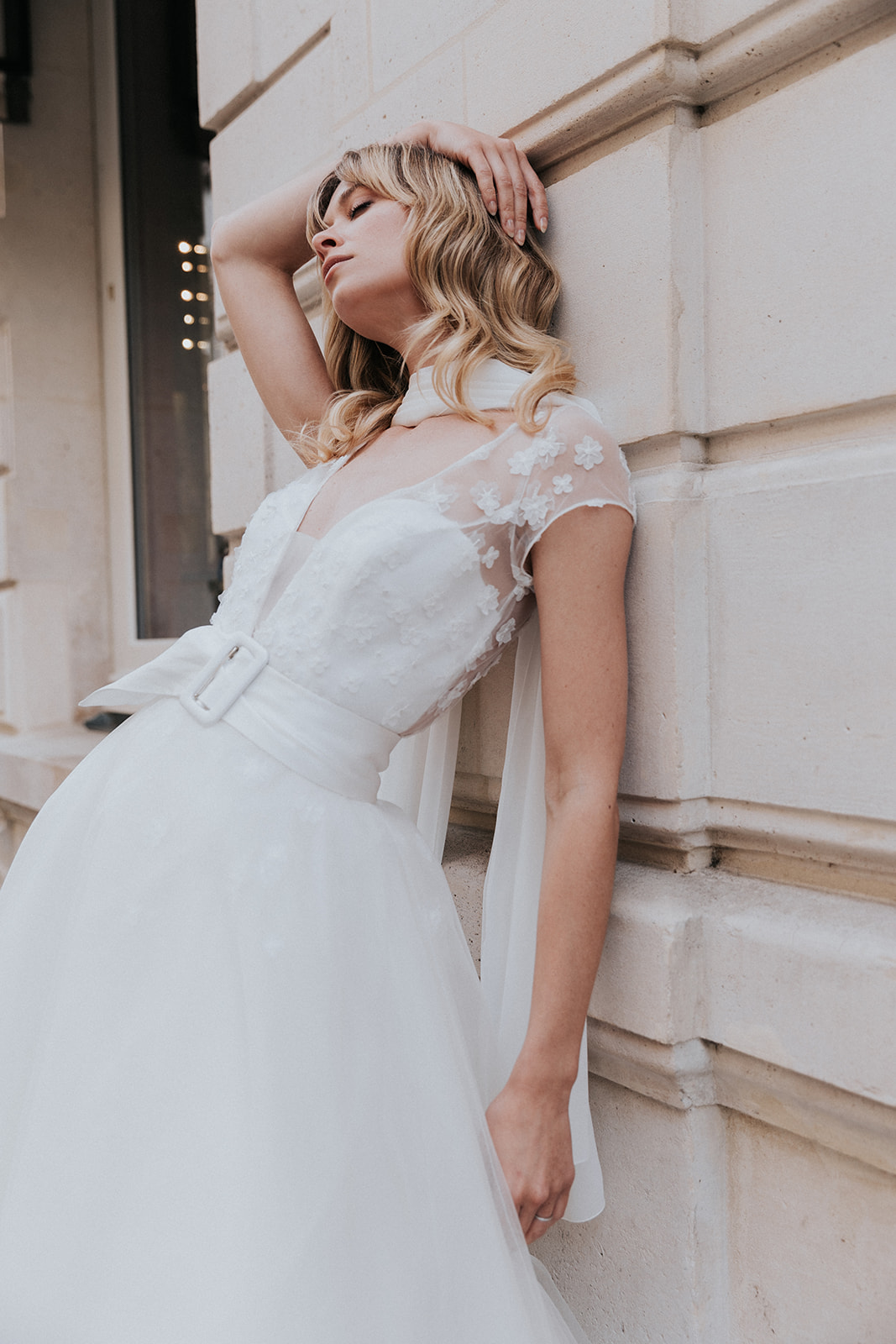 Magnifique robe de mariée New-Look faite d’organza et de tulle brodé à fleurs. Sa taille soulignée d’une ceinture à boucle vient marquer la silhouette et la mettre en valeur. Ses manches courtes et sa jupe en 7/8e incrustée de fleurs apportent un côté très romantique et princesse à l’ensemble.