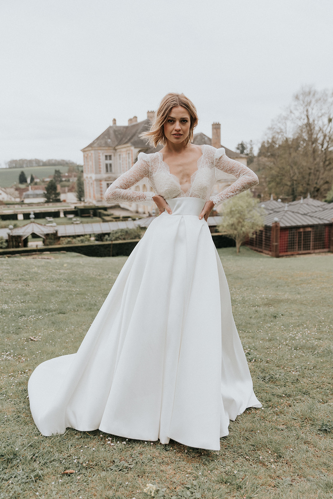 Robe de mariée princesse, mikado, dentelle de Calais, décolleté V, manches longues.