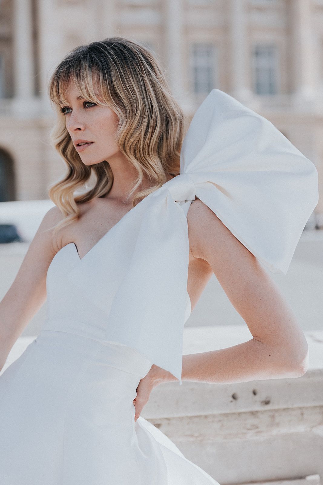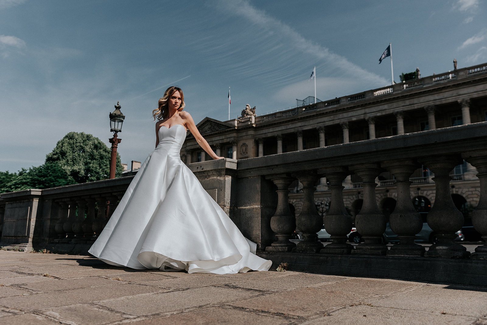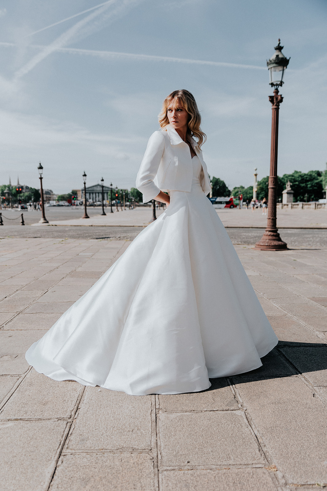 Robe de mariée guêpière ligne princesse. Volumineuse et faite de mikado, elle porte une jupe taille haute à godets qui en fait la robe de mariée princesse parfaite pour les mariées romantiques en quête du mariage princesse de leurs rêves.