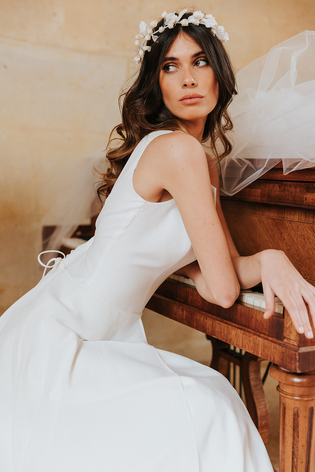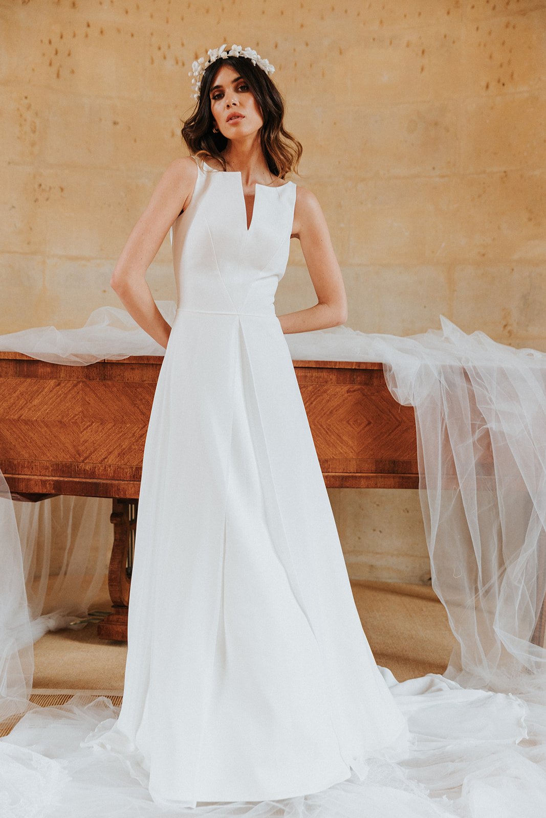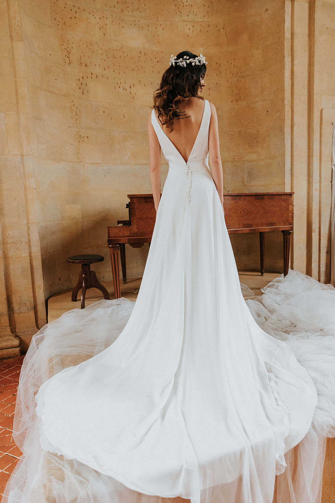 La robe de mariée Rythme, collection pour Cymbeline, est une robe de mariée fluide faite de crêpe et de mousseline. Cette robe épurée aborde un magnifique col bateau fendu au milieu, et un dos en V profond. Sa jupe superposée en crêpe et mousseline fendue sur le milieu apporte beaucoup d’élégance et de délicatesse à cette robe de mariée idéale pour vos cérémonies.