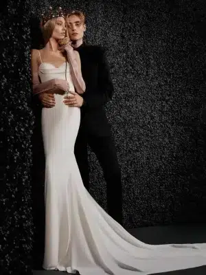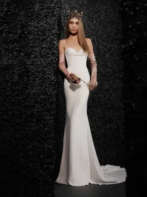 Robe spectaculaire en crêpe avec une jupe moulante, des manches longues et des détails en guipure sur les poignets et dans le dos en forme de V. Un modèle qui fait partie de notre ligne de robes de mariée durables We Do Eco