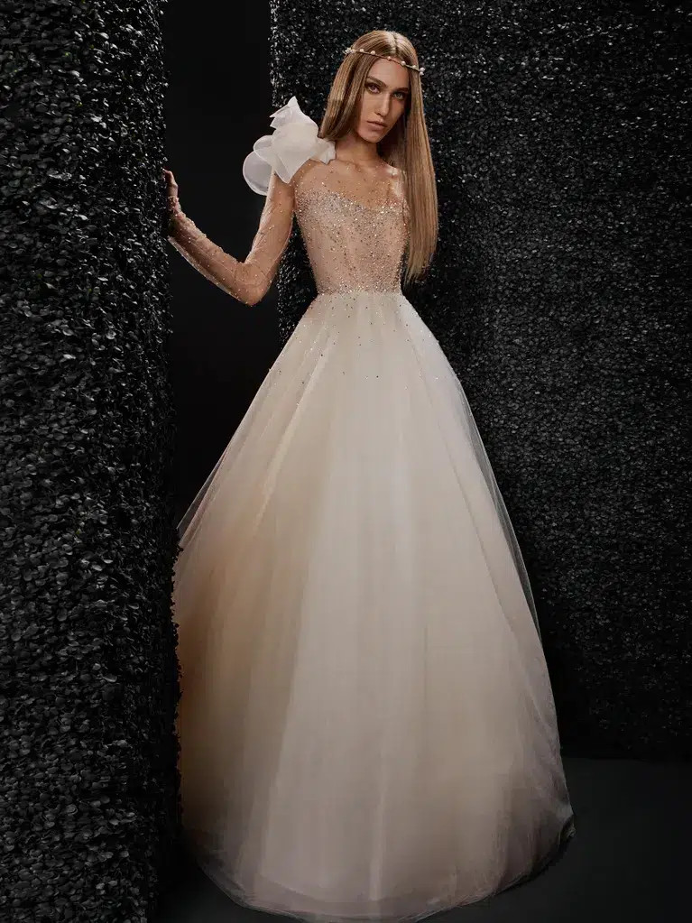 Robe princesse scintillante dans une douce teinte dorée. Corsage semi-transparent avec empiècement et manches effet illusion. Jupe légère en tulle avec effet scintillant sur les hanches. Finition avec rangée de boutons et accent floral sur l’épaule.