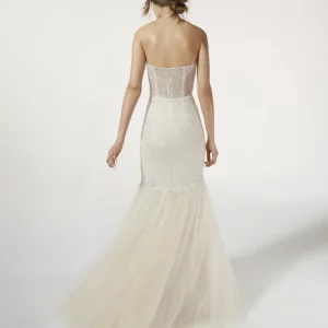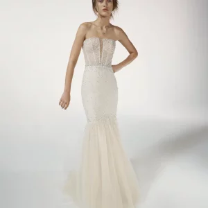 La silhouette sirène et la fantaisie des fleurs fusionnent dans cette merveilleuse robe en chantilly avec des applications de perles. Un design qui met en valeur la silhouette et accentue la féminité avec d’élégants décolletés en V.