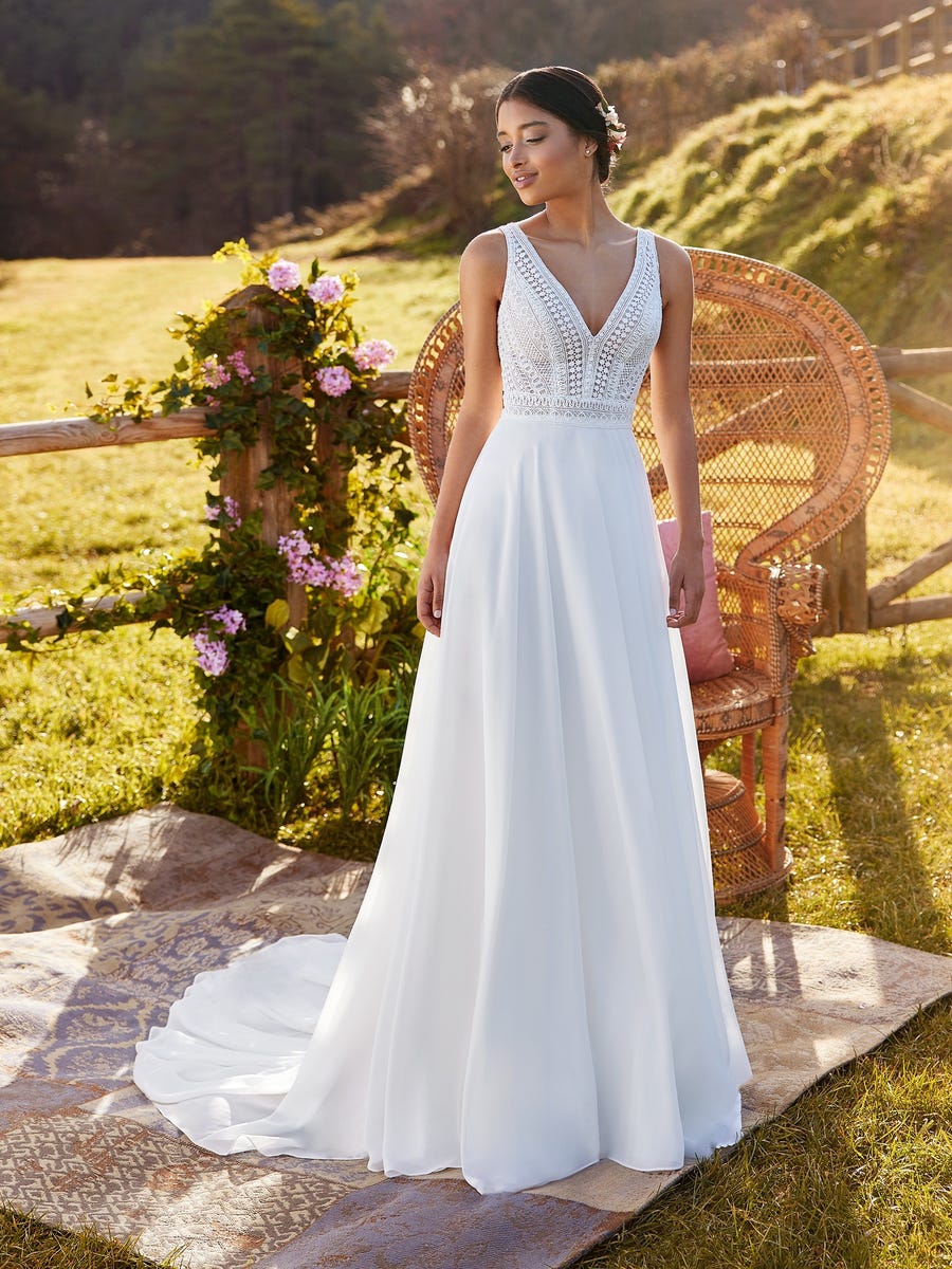 Une robe de mariée très douce avec une touche artisanale. Réalisée en mousseline de soie avec un corsage en dentelle macramé, boutonnée à l’encolure et dotée d’un dos keyhole. La robe parfaite à associer à des accessoires floraux et à un look naturel.